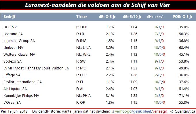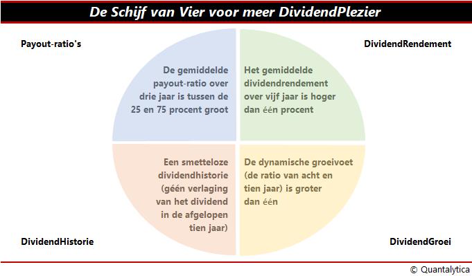 De Schijf van Vier is een totaalaanpak op maat voor dividendaandelen. Er wordt gekeken naar het dividendrendement, de dynamische groeivoet van het dividend, dividendhistorie en de payout-ratio’s. Idealiter voldoen aandelen ten aanzien van de vier selectiecriteria aan strikte minimumeisen, maar dan zou er eerder sprake zijn van een Magisch Vierkant dan van de Schijf van Vier. Daarbij komt dat het opwaartse potentieel van ‘perfecte’ aandelen eerder beperkt is. Want wat iedereen weet, maakt de markt niet meer heet.