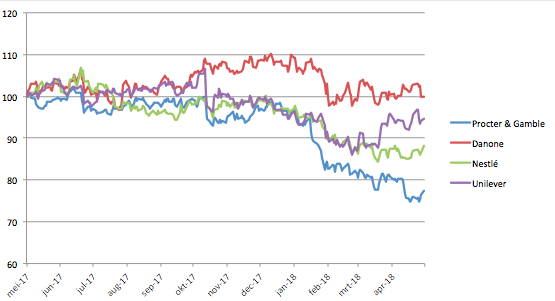 Van het viertal Danone, Nestlé, Procter & Gamble en Unilever groeit het Amerikaanse Procter & Gamble momenteel duidelijk het minste. De lage groei heeft deels te maken met de relatief kleine aanwezigheid in de groeimarkten van de opkomende landen. Ook is sprake geweest van inertie bij het management inzake de vernieuwing van producten. Aangezien innovatie producten toegevoegde waarde geeft, kan dat gepaard gaan met prijsverhogingen (een premium). Voorts is het productenpakket groot. In 2017 stond een activistische aandeelhouder op, hedgefonds Trian in de persoon van Nelson Peltz. Hij wil dat Procter & Gamble meer kosten reduceert en een einde maakt aan het verlies aan marktaandeel bij veel producten. Het bedrijf heeft daarop gereageerd met een plan om voor $10 mrd te bezuinigen, onder meer bij marketing. Ook heeft het moeten toestaan dat Peltz lid werd van het bestuur. Bij de strategie hoort ook dat sneller groeiende bedrijven worden gekocht. Recent is daartoe de consumentengezondheidstak (vitamines) van het Duitse Merck gekocht. De overname is nog niet afgerond en zal vermoedelijk pas in 2020 de winst verhogen.