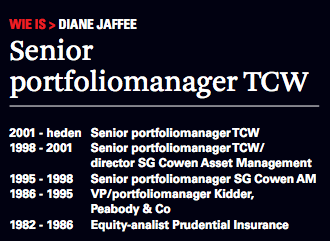 Diane Jaffee is manager van de Relative Value Group van de Amerikaanse fondsbeheerder TCW. Als waardebelegger ziet zij het momenteel niet zitten in traditionele waardesectoren zoals nutsbedrijven en telecomconcerns. De beleggingsstrategie is ingestoken op relatieve waarde, waarbij een bedrijf in aanmerking komt voor de portefeuille als het op basis van een factor die het meest relevant is voor de sector (cashflow, omzet, boekwaarde, winst of dividendrendement) goedkoper is dan de S&P500. Tevens moet er een specifieke koerskatalysator zijn, zoals kostenbesparingen, productlanceringen of een nieuw management. De portefeuille bestaat uit slechts dertig tot vijftig aandelen en in de afgelopen twintig jaar bleef de strategie vijftien keer de S&P 500 en de Russell 1000 Value Index voor.
