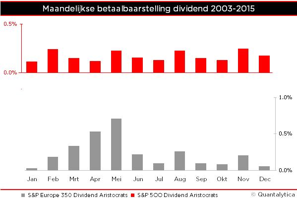 Er bestaat ook een lijst met Europese aandelen van dit soort: de S&P Europe 350 Dividend Aristocrats. Maar in Europa vindt u nauwelijks aandelen die tien jaar lang hun dividend hebben verhoogd, laat staan 25 jaar. Dat ondervond ook Standard and Poor’s toen de indexaanbieder plannen had voor de Europese variant van de S&P500 Dividend Aristocrats. Europese beleggers hechten meer belang aan de hoogte van het dividend, terwijl Amerikanen nadrukkelijk de regelmatige verhoging van het dividend waarderen. Dat verschil in waardering komt ook tot uitdrukking bij de maandelijkse distributie van het dividend, maar dat even terzijde. Omdat op het oude continent geen rijke traditie bestaat van aandelen met een smetteloze dividendgeschiedenis van 25 jaar, beoordeelt Standard and Poor’s Europese aandelen noodgedwongen op hun dividendontwikkeling over tien jaar.