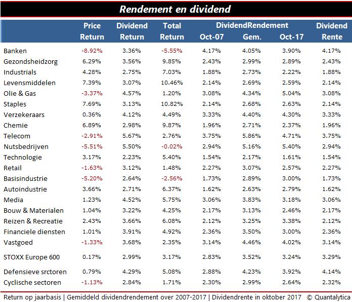 Het mooie daarbij is dat in de tussenliggende periode ook de dividendrente steeg. De meeste beleggers staan er niet bij stil, maar doordat bedrijven het dividend laten meegroeien met hun winst, stijgt het dividendrendement gekoppeld aan de aankoopprijs. Na verloop van tijd ontstaat de situatie dat uw dividendrente hoger is dan het actuele dividendrendement. De sectoren waarin dit duidelijk niet het geval is, kampen vaak met grote problemen. De Europese banken lijden nog steeds onder de gevolgen van de financiële crisis. De nutsbedrijven en dan vooral de grote elektriciteitsproducenten worstelen met de transitie naar groene stroom. De olie- en gassector zit in zekere zin in hetzelfde schuitje, hun echte kwelgeest is de snel dalende olieprijs op de internationale grondstoffenmarkten.