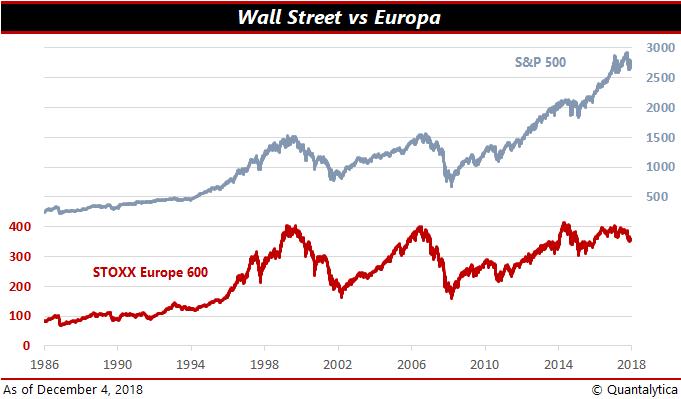 Op dit moment (4 december 2018) doet de STOXX600 zo’n 360 punten. Dat is een procent of tien onder de top van 2007, tevens de all-time-high. Dat komt afgerond neer op een gemiddeld verlies van net geen 1% per jaar. Echter, het dividend buigt het verlies om in winst! Het totaalrendement (koersontwikkeling + dividendrendement) over die periode bedraagt op jaarbasis net geen 2%.