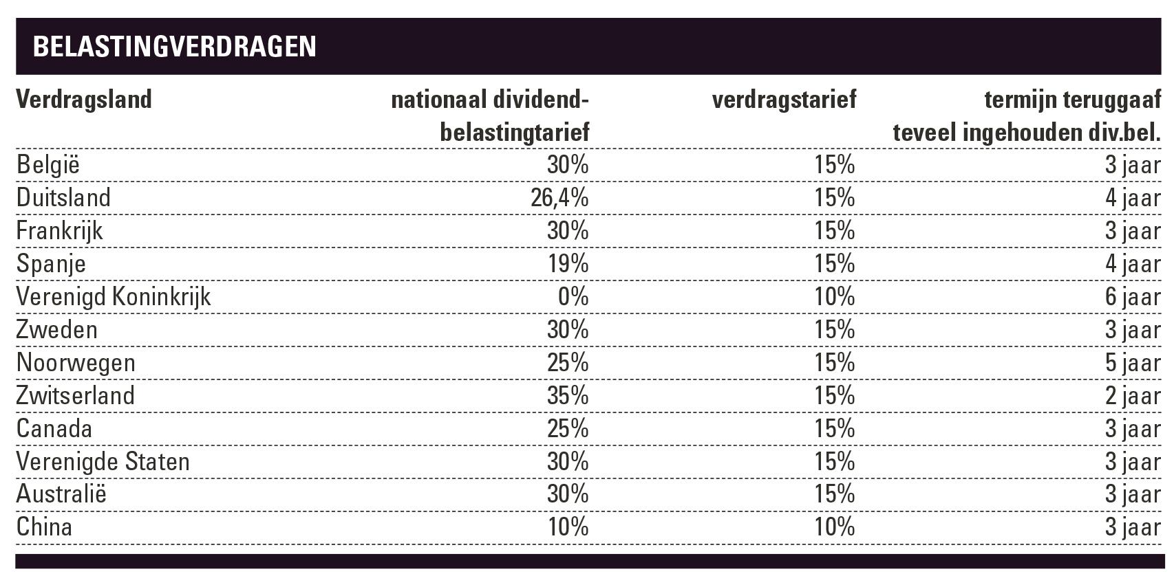 Als een beursgenoteerd bedrijf zijn hoofdkantoor heeft in een land waar Nederland een belastingverdrag mee heeft, en het nationale dividendbelastingtarief hoger is dan de doorgaans in het belastingverdrag overeengekomen 15%, kan het meerdere door de belegger bij de belastingdienst van dat land worden teruggevraagd. Dat moet wel gebeuren binnen de in de tabel opgenomen termijnen (gegevens van januari 2018). De termijn waarop dit kan, vangt aan direct na afloop van het kalenderjaar waarin de dividendopbrengst is genoten.