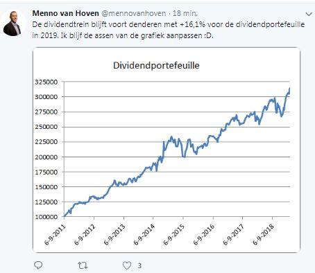 De dividendportefeuille, in 2019 goed voor een rendement van 16,1%, bereikte bij de slotkoersen van maandag opnieuw een hoogste stand ooit met een waarde van inmiddels €314.622.