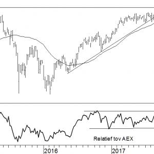 Relatief ten opzichte van de AEX-index is een minder spectaculair beeld zichtbaar. De relatievesterktelijn beweegt al een jaar binnen een horizontale bandbreedte. Dat wijst op een prestatie van opkomende markten die gelijk is aan die van Nederlandse aandelen.