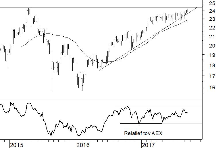 Relatief ten opzichte van de AEX-index is een minder spectaculair beeld zichtbaar. De relatievesterktelijn beweegt al een jaar binnen een horizontale bandbreedte. Dat wijst op een prestatie van opkomende markten die gelijk is aan die van Nederlandse aandelen.