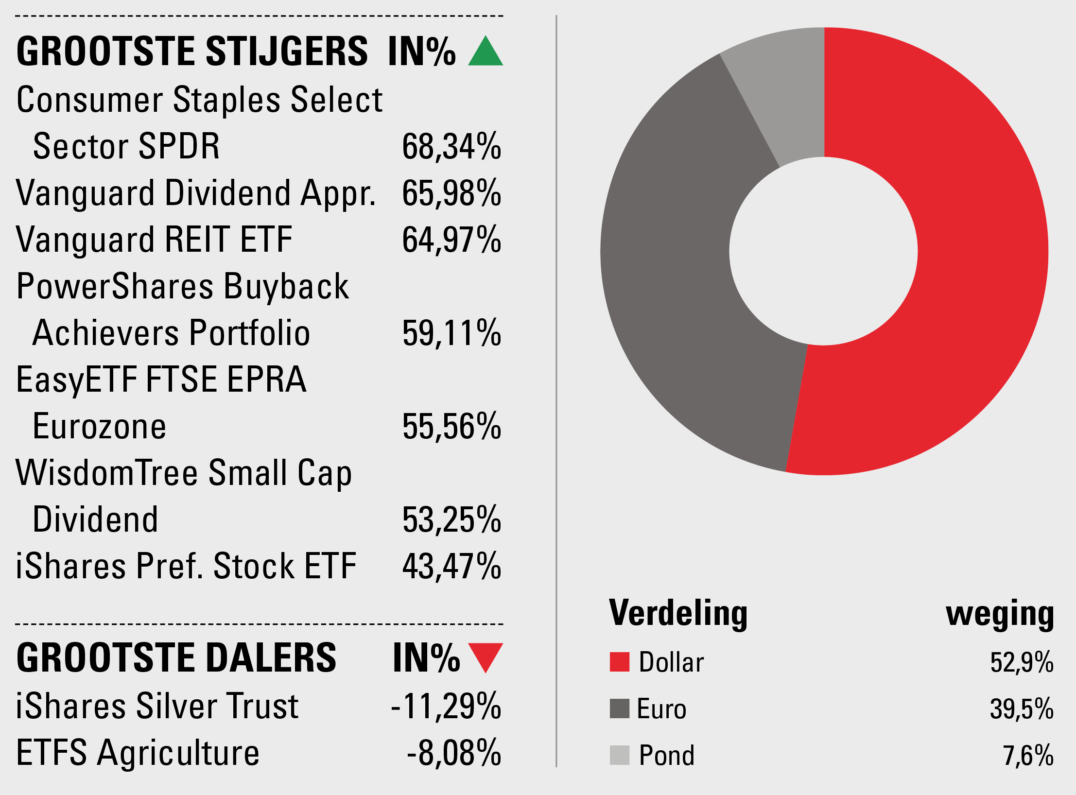 De ETF-portefeuille blijft dit jaar duidelijk achter bij andere portefeuilles en bij veel indices. Een belangrijke oorzaak daarvan is de gedaalde Amerikaanse dollar, die aardig wat procentpunten rendement scheelt. De S&P500 bijvoorbeeld staat dit jaar op een rendement inclusief dividend van 11,0%, maar dan wel in dollars gemeten. In euro’s is het nog maar 2,2%. De ETF-portefeuille zit voor 52,9% in Amerikaanse ETF’s. Dit percentage hebben we dit jaar al teruggebracht. Dat dit percentage hoog is, komt (onder andere) door het succes van Amerikaanse ETF’s de afgelopen jaren. Van de zes ETF’s met een rendement van meer dan 50% zijn er vijf Amerikaans. Door deze waardestijging is het gewicht in de portefeuille groter geworden dan bij de start van de portefeuille. Op dit moment ondernemen we geen actie vanwege de valutasituatie. Valutaspeculatie is niet het doel en winnaars verkopen onverstandig.