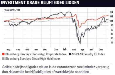 Daar staat tegenover dat solide dollar-bedrijfsobligaties beter presteren in onrustige markten dan aandelen of high yield-bedrijfsobligaties. Tijdens de coronacrisis bedroeg de maximale daling van de Bloomberg Barclays-index van solide bedrijfsobligaties van top naar bodem 14%. Dat is fors, maar wel veel minder dan de bijna 22% van de wereldwijde high yield-index of de 33,7% van de wereldwijde aandelenindex (zie grafiek).