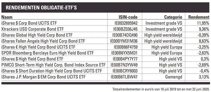 Veruit de beste rendementen zijn behaald door de iShares $ Corp Bond UCITS ETF en de Xtrackers USD Corporate Bond ETF. Deze ETF’s beleggen in solide bedrijfsobligaties – investment grade genoemd – die in dollars zijn uitgegeven. Ook de iShares Fallen Angels High Yield Corp Bond ETF presteerde prima. ‘Fallen angels’ zijn bedrijfsobligaties die bij uitgifte een investment grade-rating kregen van de kredietbeoordelaars, maar die sindsdien zijn gedegradeerd naar het high-yieldsegment van de meer risicovolle obligaties. Binnen het high-yieldsegment vormen deze fallen angels overigens wel de kwalitatief betere obligaties, met een wat hogere kredietwaardigheid en doorgaans ook een langere looptijd.