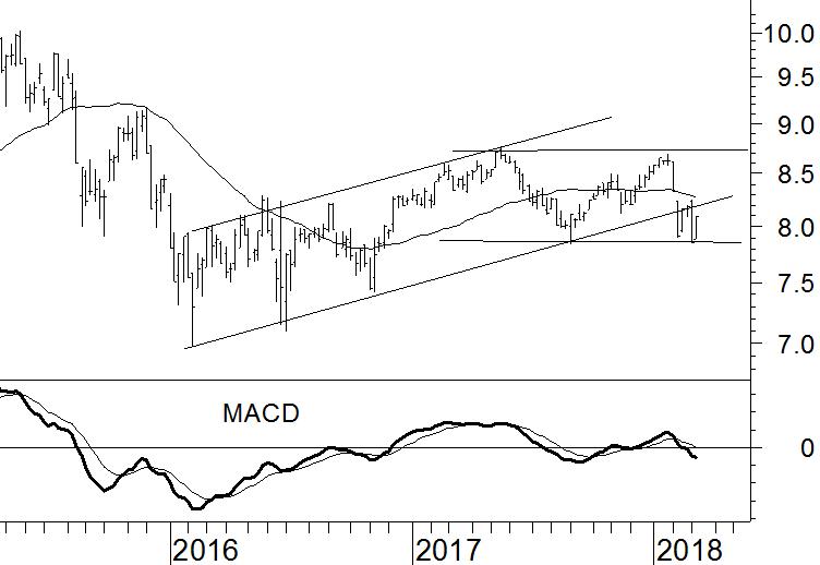 De Britse FTSE100 had het in 2015 zwaar. 2016 stond in het teken van herstel, en in 2017 ontwikkelde zich een zijwaartse bandbreedte. Deze range duurt inmiddels al dusdanig lang dat het stijgend trendkanaal, dat zich vormde in 2016, is verlaten. Zolang de koers zich in de zijwaartse range beweegt, geldt een houdadvies. Als de koers door de onderkant zakt, wordt een verkoopadvies van kracht. Aan de andere kant geeft een doorbraak door de bovenkant van de range een koopsignaal.