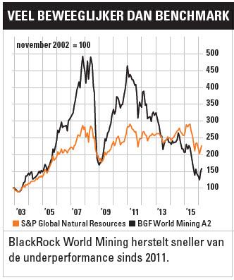 31-3-2016 16-46-01BlackRock World Mining is een van de grootste beleggingsfondsen in de categorie grondstoffenaandelen. De koersbewegingen zijn sinds de oprichting van het fonds veel groter geweest dan die van de markt. In opgaande trends ging de koers veel harder omhoog, maar als de markt daalde waren de koersbewegingen van het fonds ook veel groter. Over de jaren 2011-2014 heeft het fonds een dramatische ‘underperformance’ laten zien. Volgens Morningstar komt dit door matige stockpicking, te lage blootstelling aan goudmijnen, een structurele onderweging vis-à-vis de index naar de megacaps en een grove onderschatting van de kracht van de neergang van grondstoffen. Tevens liggen de kosten van het fonds iets boven het gemiddelde.