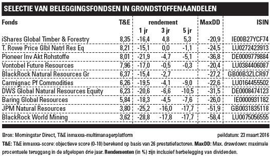 Grondstoffenaandelen hebben onder de daling van de grondstoffenprijzen erg te lijden gehad. Beleggers hebben evenwel overdreven in hun pessimisme. Goudmijnen en oliemaatschappijen hebben zo langzamerhand interessante waarderingen gekregen, bijvoorbeeld in termen van dividendrendement. Het beleggen in dergelijke aandelen ligt eerder voor de hand.
