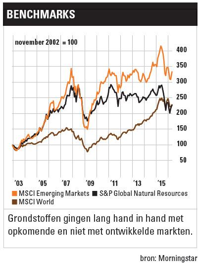 Er zijn ook positieve geluiden. ABN Amro-analiste Georgette Boele vindt vooral goud interessant. Zij draaide haar negatieve visie op goud toen de rentes negatief werden. Goud geeft volgens haar weliswaar 31-3-2016 16-42-53geen inkomsten maar er hoeft tenminste geen negatieve rente te worden betaald. Voormalig grondstoffenhandelaar Burt Rothberg, tegenwoordig onafhankelijke analist, gelooft dat we de bodem in de meeste grondstoffen hebben gezien. Op inflatiegecorrigeerde basis zijn de grondstoffenindices terug op het niveau van 1999, toen grondstoffen ook in een grote crisis zaten door allerlei problemen in de opkomende markten. Vooral agrarisch producten zijn volgens hem nu veelbelovend. Hij wijst op de samenhang met opkomende markten, die ook dicht bij een bodem in de koers zouden zitten. Grondstoffen en opkomende markten zijn inderdaad lange tijd gelijk op en neer gegaan, hoewel grondstoffenaandelen de laatste jaren wat achterop zijn geraakt (zie grafiek). Wat betreft de olieprijs rekent hij op een langzame stijging. Ook vermogensbeheerder Pioneer heeft voor verschillende commodities licht stijgende koersen voorspeld: in 2017 komen olievraag en -aanbod weer met elkaar in balans en de prijs kan eind volgend jaar herstellen naar een niveau tussen de $45 en $55.