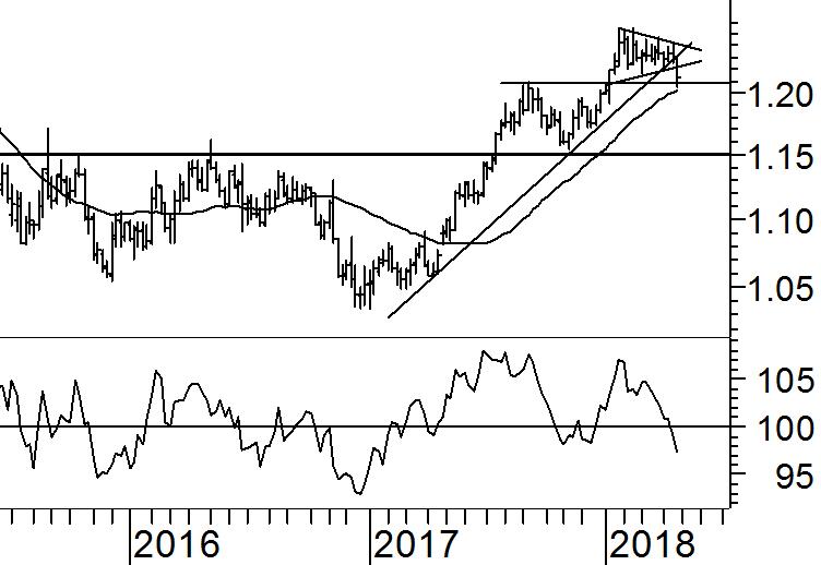 Het koppel EUR/USD bevindt zich sinds begin 2017 in een opwaartse trend. De afgelopen week zijn er voor het eerst sinds tijden deukjes in dit beeld ontstaan. Eerst viel EUR/USD uit een symmetrische driehoek. Dit duidt op het inzetten van een neerwaartse beweging, zij het nog wel binnen de huidige opwaartse langetermijntrend. Deze beweging forceerde ook een neerwaartse doorbraak door de steunlijn, getrokken onder de bodems sinds begin 2017. Ook dit is niet direct een aanwijzing dat de trend op z’n laatste benen loopt, wel dat het momentum van de trend aan het afzwakken is. Dit wordt ook goed geïllustreerd door het 12-weeks momentum dat onder de grafiek is afgebeeld. Het momentum staat op het laagste niveau sinds wederom begin 2017.