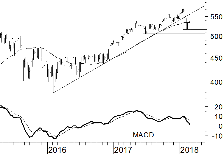 Beleggers met een kortere beleggingshorizon richten zich nu op de steun van 515 (laagste koers van de laatste correctie). Zolang deze steun houdt, kan het herstel mogelijk wat meer ‘body’ krijgen. Onder de 515 komt in eerste instantie de 505-steun in beeld. Voorlopig blijft het houdadvies van kracht. Pas als de koers een lagere top maakt en door de belangrijke steun rond 505 zakt, krijgt de AEX een verkoopadvies.