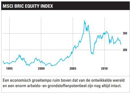 Sinds eind 2012 zijn de beurskoersen in Brazilië, Rusland, India en China met gemiddeld ruim 12% gedaald en over de afgelopen vijf jaar komt de daling op ruim 6% per jaar. Maar de belangrijkste factoren achter de opmars van de BRIC-landen, zoals een economisch groeitempo dat ruim boven dat van de ontwikkelde wereld ligt en een enorm potentieel aan arbeidskrachten en grondstoffen, zijn grotendeels nog steeds van kracht.