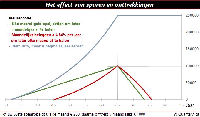 Hoewel er expliciet niet op in werd gegaan, als u bij het rekenvoorbeeld met 7% rente 13,5 jaar eerder begon met beleggen en rekening houdt met een jaarlijkse inflatie van 2%, komt u na periode van 33 jaar (en 4 maanden) ‘sparen’ in een situatie terecht waarbij u vanaf uw 65ste geld kunt onttrekken omdat de hoofdsom door de onttrekkingen niet wordt opgepeuzeld.