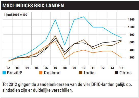 In opkomende markten stond het decennium na 2002 in het teken van de snelle infrastructuuruitbouw in India en vooral China. Dit leidde tot een enorme toename van de consumptie van grondstoffen zoals olie en ijzererts, die geleverd werden door Rusland en Brazilië. De MSCI Emerging Markets Index leverde in dit decennium een gemiddeld jaarrendement op van ruim 23%. Het is geen enkele keer voorgekomen dat een van de landen een andere koersrichting koos dan de andere. De rally werd alleen onderbroken door de beurscrash van 2008 en door een correctie in 2011.