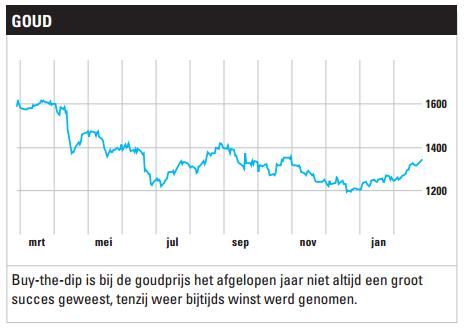 Te snel kopen na een koersdaling kan gevaarlijk zijn. Het begin- en eindpunt van een dip laat zich niet voorspellen, en meerdere dips kunnen elkaar opvolgen. Een goed voorbeeld hiervan is de goudprijs (zie grafiek). Wie rekent op een dip of correctie en besluit aan de zijlijn te blijven, kan ook rendement mislopen, bijvoorbeeld als de markt nog 15% stijgt en daarna pas de verwachte correctie van 10% volgt. Te voorzichtig opereren kan heel frustrerend zijn. In het algemeen is het lucratiever om te blijven zitten dan te proberen de markt te timen. Veel actieve fondsbeheerders kunnen de benchmark niet bijhouden, mede door de vele transactiekosten die zij maken.