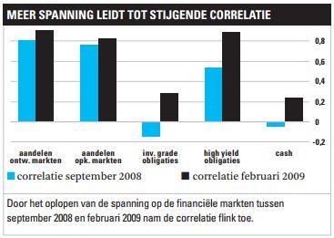 De overeenkomst van het koersverloop van twee verschillende beleggingen wordt aangeduid met het begrip correlatie. Bij een correlatie van 1 gaan de prijzen volledig gelijk op, bij -1 zijn ze volledig tegengesteld en bij 0 is er geen enkele overeenkomst. Maar zelfs een portefeuille waarin alle posities een lage of negatieve correlatie hebben, biedt geen waterdichte bescherming. Door schommelende koersen verandert de correlatie namelijk voortdurend.
