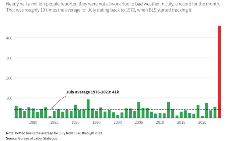 Daar komt bij dat orkaan Beryl aan het begin van de maand over Texas trok. In de nasleep van de storm zaten 2,7 miljoen huizen en bedrijven in de buurt van Houston dagenlang zonder stroom. Een belangrijke reden waarom klimaatverandering niet is aangewezen als (mede)oorzaak van de oplopende werkloosheid, is dat het Bureau of Labour Statistics (BLS) dat de cijfers verzamelt meldt dat Beryl geen impact had op de banengroei.
