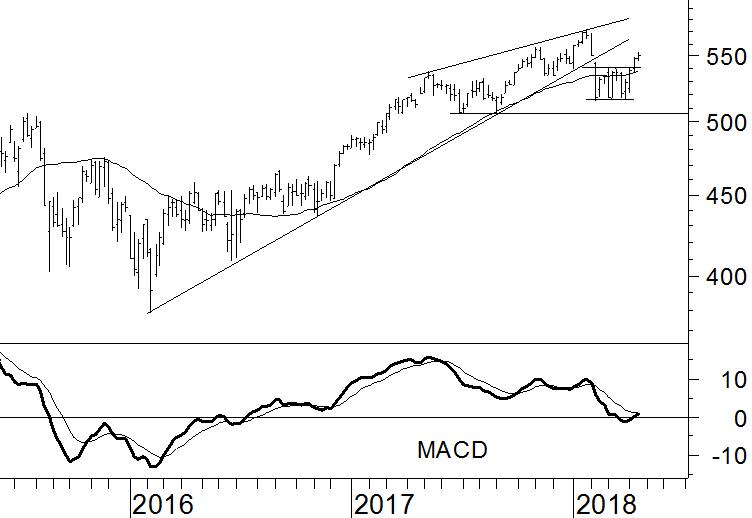 Het technische beeld van de AEX is neutraal, nu de index is ontsnapt uit de zijwaartse bandbreedte tussen 515 en 540. Nadat de koers begin februari uit een stijgende wigformatie was gezakt, bewoog hij zijwaarts in een horizontaal patroon. We hebben twee maanden afgewacht om te zien waar de AEX zou uitbreken. Aanvankelijk waren de kansen op een neerwaartse doorbraak iets groter, maar de index koos toch voor de richting omhoog.