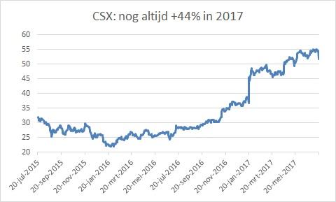 Het aandeel CSX, de grote uitblinker dit jaar binnen de dividendportefeuille, leverde woensdag 5,1% in op $51,87 nadat intraday zelfs een verlies van ruim 7% op het bord stond.