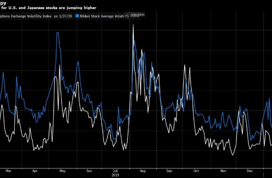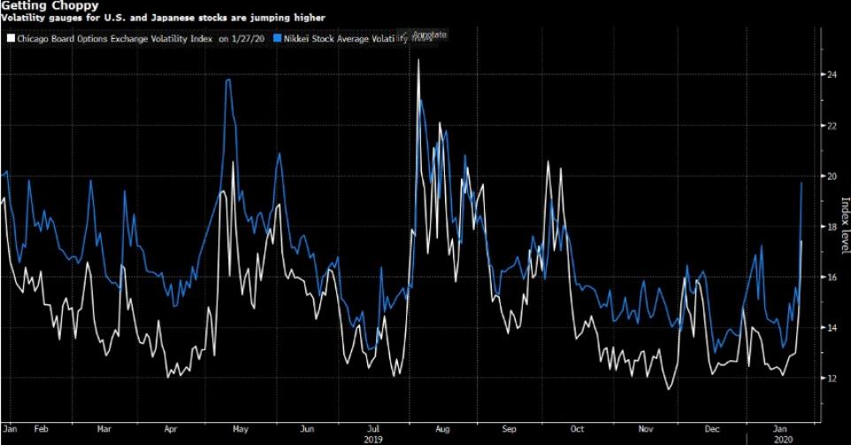 De dalende olieprijs en de uitbreiding van het probleem met de corona-griep had allerlei effecten in de financiële markten. Zo werd de koers van de Chinese munt zwakker en stegen de obligatiekoersen van zogeheten veilige beleggingslanden als Duitsland en de VS (en daalden er dus de rentes). Ook de volatiliteit in de aandelenmarkten nam er iets door toe, zoals blijkt voor Japan en de VS in deze Bloomberg-grafiek.