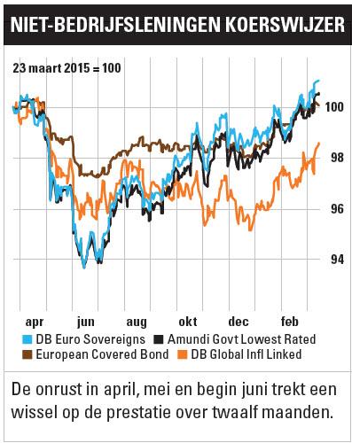 Wij vinden de staatsschuld van euro-kernlanden als Duitsland onaantrekkelijk; de rente is heel laag en de kans op koersverlies dus groot. Gezien het ECB-beleid hebben wij in de Koerswijzer wel twee ETF’s opgenomen met een overweging in Italiaanse en Spaanse staatsschuld, waarvan de rente nog kan dalen. Dat klopt sinds 6 juni 2015 (gemiddeld +6%, stand van 17 maart), maar over de afgelopen twaalf maanden gemeten telt de obligatie-onrust van april, mei en begin juni 2015 nog mee, toen de ECB met de uitvoering van haar opkoopbeleid begon, en is het rendement met 0,3% van de DB Euro Sovereign Yield Plus bijna nul. De Amundi-ETF staat zelfs op -0,2%. De gedekte obligaties van Nordea deden 0,5% (maar slechts 2% sinds 6 juni 2015). Gedekte obligaties profiteren dus maar beperkt van het beleid waarmee de ECB de inflatie wil bevorderen. Dat dit niet lukt, laat de DB Global Inflation Linked ETF zien. Het totaalrendement ervan steeg in twaalf maanden met 0,2%, en met 1,1% sinds 6 juni 2015.