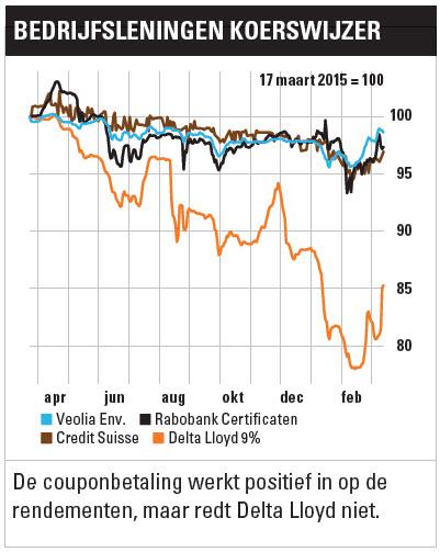 Twijfel over de financiële sector heeft de laatste twaalf maanden de obligatiekoersen met hoge kredietstatus uit die sector geraakt. De Rabo 6,5% certificaten daalden met 3,1% (stand van 17 maart), maar door de coupon steeg het rendement wel met 2,7%. Bij de dollarlening Credit Suisse 7,875% daalde de koers met 3,4%, bij een positief rendement van 4,2%; in euro’s was dat 0%. Het nutsbedrijf Véolia Environnement kende bij de 4,45% obligatie een koersdaling van 1,4%, met een stijging van het rendement van 2,8%. De Delta Lloyd 9% obligatie springt er met een koersdaling van 14,6% negatief uit. Er waren bedrijfsspecifieke problemen, maar de onzekerheid over de solvabiliteit wordt opgelost met een aandelenemissie, wat uiteraard de couponbetaling zekerder maakt. Inclusief de coupon kwam het rendement op -8,2%. De vier leningen kennen een positief rendement tot de aflossing, oplopend van 1,9% (Véolia), 4,0% (Credit Suisse), 5,9% (Rabo) tot 6,5% (Delta Lloyd).