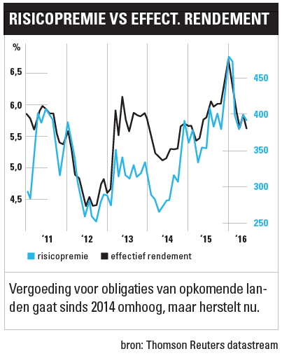 Obligaties van opkomende landen hebben het sinds 2014 slecht gedaan, maar vanaf 2016 is sprake van herstel. De risicopremie op dit soort leningen in ‘hard currency’, volgens de JPM EMBI GD-index, is over deze periode gemiddeld genomen met 125 basispunten (1,25%-punt) gestegen (zie grafiek). De vergoeding op leningen in lokale valuta is minder hard opgelopen, maar de valuta’s zijn gemiddeld genomen met 30% gedaald ten opzichte van de Amerikaanse dollar (bron: Lazard, mei 2016). Ondanks het gunstigere instapniveau is een verdere verzwakking van lokale valuta’s niet volledig uit te sluiten. Dit geldt vooral als de Amerikaanse centrale bank (Fed) toch sneller dan nu wordt verwacht de rente verhoogt en kapitaal weer vanuit opkomende landen naar de VS stroomt.