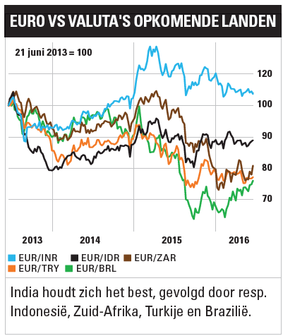 De gemiddelde groei voor opkomende landen is sinds 2010 ieder jaar afgenomen. Het groeiverschil met de Verenigde Staten bevond zich vorig jaar zelfs op het laagste niveau van het afgelopen decennium. De perspectieven lijken echter langzaam te verbeteren. Door de gedaalde valuta’s is de concurrentiepositie verbeterd. De inflatie is afgenomen waardoor centrale banken in veel landen de economie kunnen stimuleren. Hierbij helpt het nog eens extra dat de kans op snelle verhogingen van de Amerikaanse beleidsrente door de Fed is afgenomen. Verder ondersteunt de gestegen olieprijs de olieproducerende landen en zijn de saldi op de lopende rekeningen verbeterd. Met uitzondering van Turkije, Zuid-Afrika en Colombia zijn er geen grote opkomende landen meer met een tekort boven de 3%.