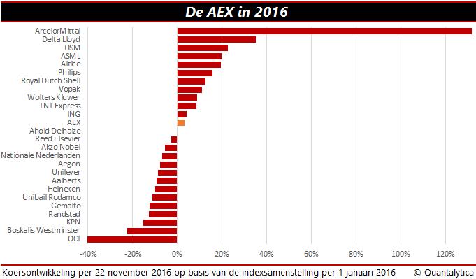 Als we dit jaar naar de Nederlandse beurs kijken, dan had u zonder meer de aandelen van ArcelorMittal moeten hebben. De koers van de staalreus steeg tot dusver in 2016 met 132% tegenover een mager winstje van 3,3% voor de AEX.