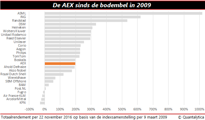 Als u echter op het dieptepunt van de markt was ingestapt, dan zit u nog altijd met een verlies van 34%. Zelfs als u het dividend erbij telt, staat u nog in de min, te weten: -21,8%. Nochtans verdubbelde de koers van de AEX tussen 9 maart 2009 en nu én is de waarde van de hoofdindex per 22 november 2016 dankzij de herbelegging van het dividend verdrievoudigd. Overigens, het topaandeel is ASML.