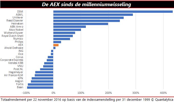 Gaat u nog verder terug in de tijd, bijvoorbeeld naar de millenniumwisseling, dan zult u zien dat chemieconcern DSM het sterkste aandeel uit de AEX is, terwijl chipmachinefabrikant ASML verdienstelijk tweede is én kijkt ArcelorMittal altijd nog tegen een verlies aan van -18%. Maar laten we er niet omheen draaien: het had u veel erger kunnen vergaan als u (uitsluitend) in ronkende namen van weleer als Baan, Fortis, Aegon of KPN had belegd.