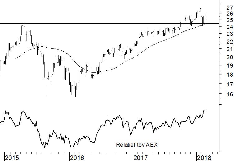 Ook belangrijk is het feit dat de markten het beter doen dan bijvoorbeeld de eigen AEX-index. Dat blijkt uit de relatievesterktelijn (rs-lijn) die in de grafiek is afgebeeld. Nu de rs-lijn is uitgebroken boven een zijwaarts patroon zet de periode van outperformance zich voort. Zowel absoluut als relatief zijn de vooruitzichten daarmee uitstekend. Opkomende markten horen dan ook thuis in een wereldwijd gespreide portefeuille.