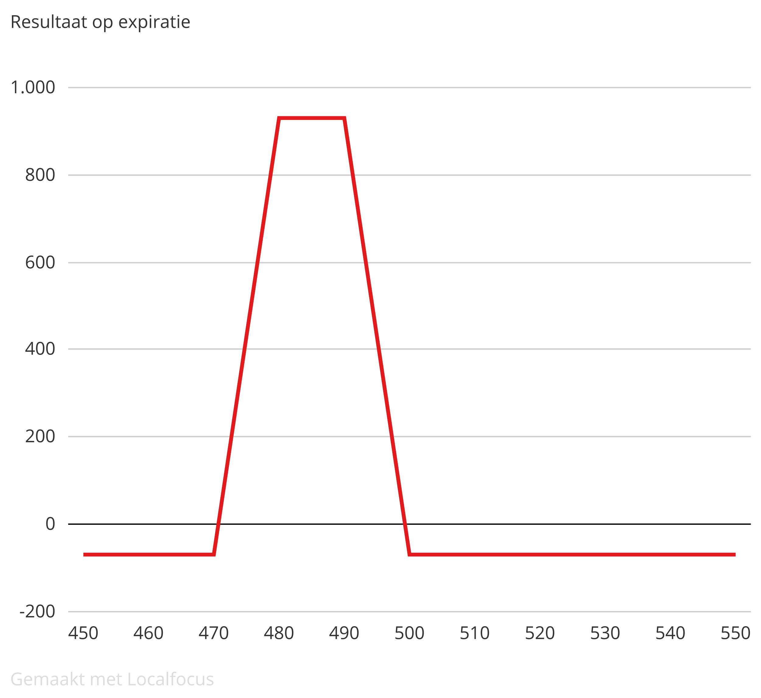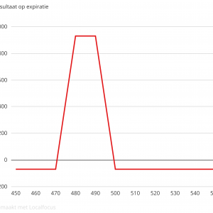Concreet gaat het om een gekochte AEX mei18 500/490 putspread, die op het moment van schrijven €1,30 kost, en het verkopen van de 480/470 putspread in dezelfde maand. Deze levert op het moment van schrijven €0,60 op. Per saldo kost deze combinatie dus €0,70. Maal de contractgrootte van 100 is dat €80. Deze constructie word ook wel een condor genoemd. Als de AEX op de dag van expiratie in mei tussen 480 en 490 punten staat, bereikt deze condor de maximale waarde, €10,00.