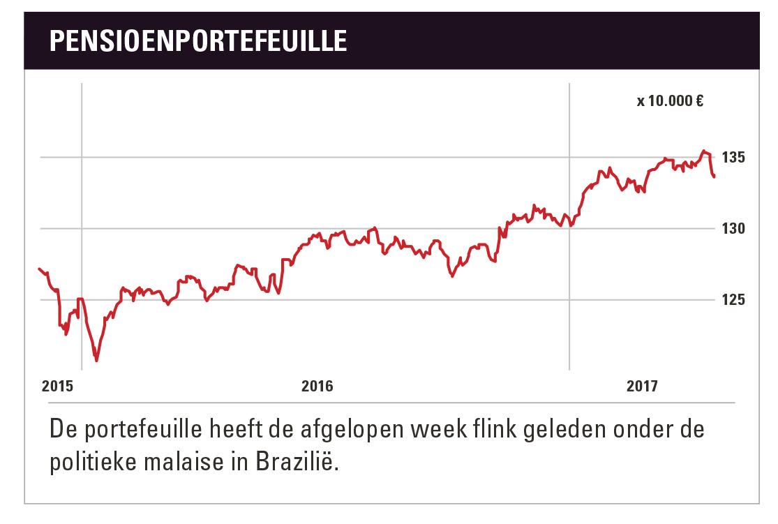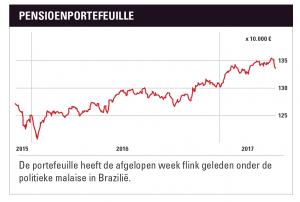 Het rendement van de pensioenportefeuille had deze week op alle fronten met tegenwind te kampen. Daardoor liep het rendement over 2017 terug van 3,9% vorige week tot 2,7% deze week. De grootste klappen vielen in onze posities in aandelen uit opkomende landen (zie ook kader). Dat was te wijten aan de voortwoekerende politieke crisis in Brazilië. Ook in de VS is er sprake van politieke onrust – zij het lang niet zo hevig als in Brazilië – en ook dat raakte de portefeuille. De koersen van onze posities in Europese aandelen reageerden heviger op de onrust rond president Trump dan de posities in Amerikaanse aandelen. Zo verloor de iShares STOXX Europe Small 200 ETF twee procentpunt in een week tijd en het Comgest Growth Europe Fund bijna 1,7 procentpunt. De koersen van de PowerShares FTSE RAFI US 1000 ETF en de ProShares S&P500 Dividend Aristocrats ETF verloren respectievelijk 0,8% en 0,2% in dollars. De grootste klap voor de pensioenportefeuille kwam echter van de daling van de dollar ten opzichte van de euro van bijna 2,1% in een week tijd. Daardoor daalde het rendement op de PowerShares FTSE RAFI US 1000 ETF in euro’s met maar liefst 2,8%. De daling van de dollar trok ook een wissel op onze veilige havens: goud en solide Amerikaanse bedrijfsobligaties. In dollars stegen de koersen van onze posities in deze twee categorieën met respectievelijk 1,9 en 0,8%. Omgerekend in euro’s liep het rendement in week tijd echter met respectievelijk 0,2 en 1,3 procentpunt terug.