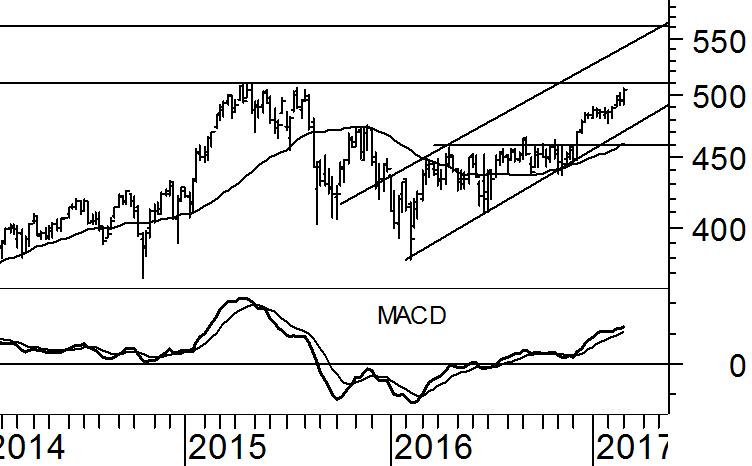 De AEX-index heeft de week voor het eerst sinds augustus 2015 afgesloten boven de 500-grens. Dat geeft extra cachet aan het toch al positieve technische beeld van de Amsterdamse beursbarometer. Onverwachts was de slotstand niet. Het patroon van toppen en bodems is overtuigend opwaarts gericht, en dat geldt ook voor het 40-weeks gemiddelde. De kans op een doorbraak van het 510-niveau achten wij aanzienlijk, ondanks de verkoopdruk die zich daar bevindt.