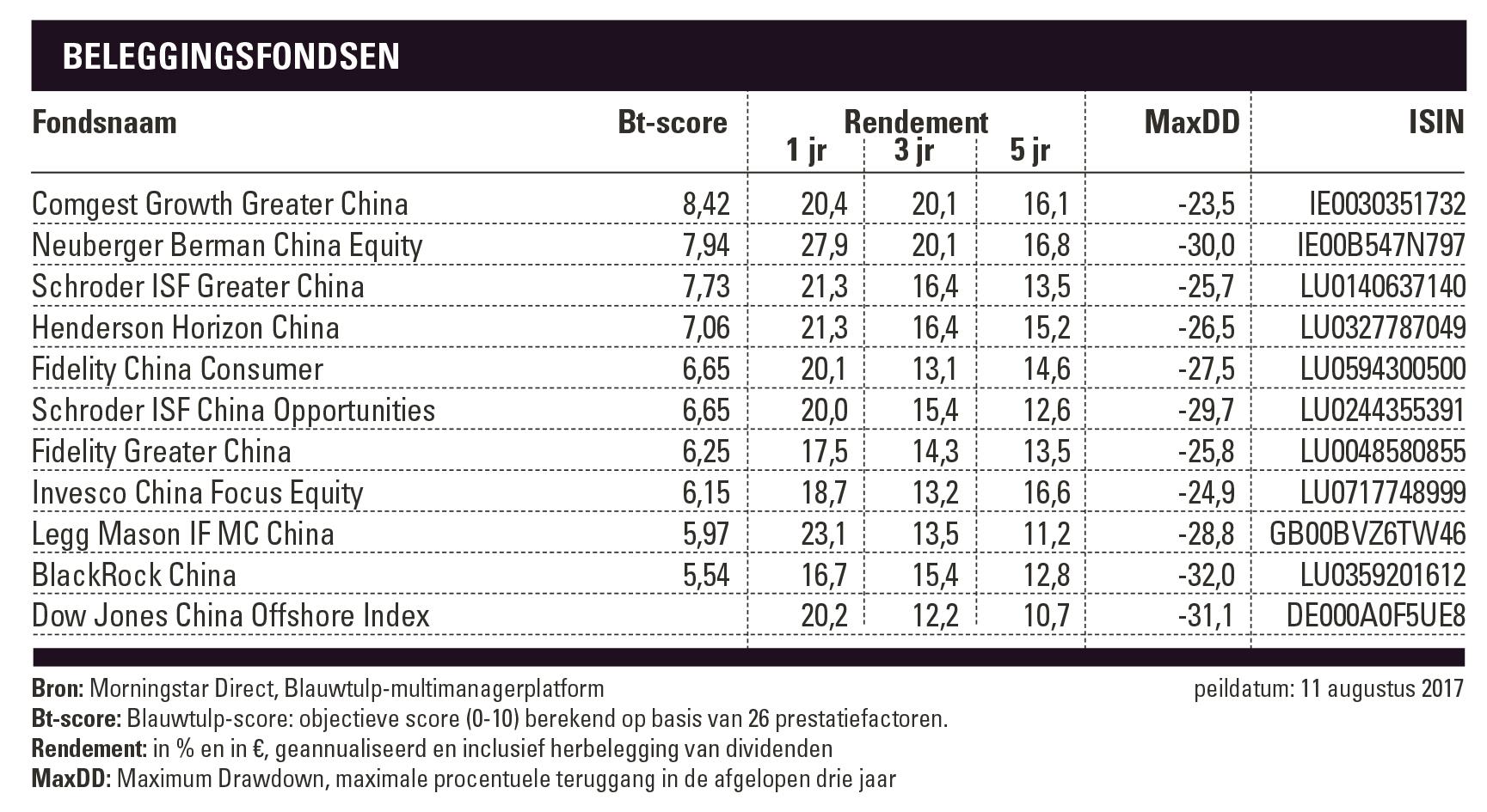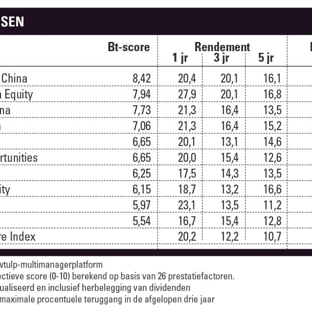 Selectie door deskundige analisten is van cruciaal belang, willen beleggingen in China winstgevend zijn. Vermogensbeheerder Blauwtulp (het vroegere T&E Inmaxxa) en onze medewerker Harry Geels hebben voor Beleggers Belangen weer een lijst van de fondsen met de beste resultaten opgesteld (zie bovenstaande tabel). Een belangrijk deel van de tips van de vorige keer presteerde goed en kon dus worden gehandhaafd, ondanks de daling van de Shenzen-index. Het gaat bij de tips om beleggingen in Groot China (inclusief Taiwan en Hongkong). Zij worden afgezet tegen de resultaten van een benchmark.