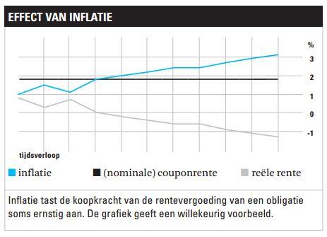 Inflatie kan ertoe leiden dat het reële rendement negatief is. Bij een (nominale) rentevergoeding van 2% en een inflatie van 3% is de reële vergoeding voor de obligatie dus -1%. Deze situatie speelt nu bij leningen van AAA-landen als Duitsland. Beleggers hechten zo aan de zekerheid van de rentebetaling en aflossing, dat zij koopkrachtverlies accepteren. Dit gedrag kan vooral verwacht worden in tijden van onzekerheid in andere delen van de financiële markten.