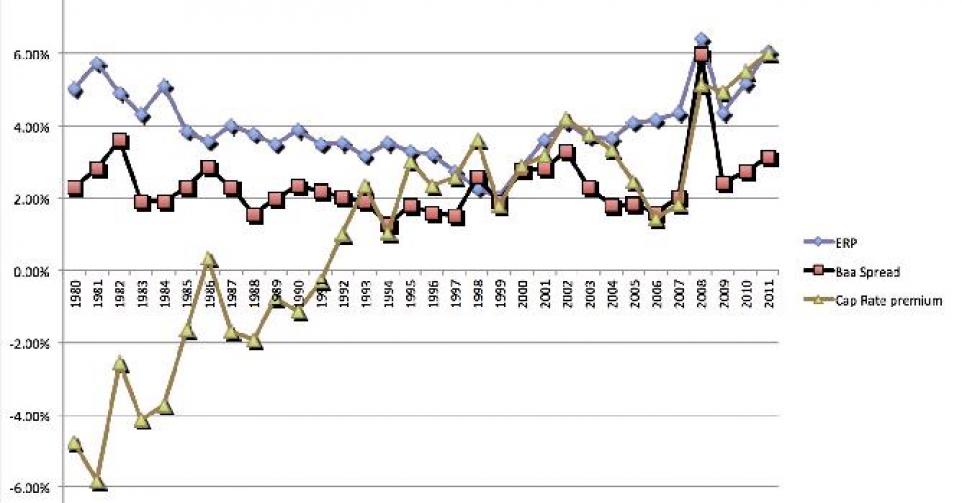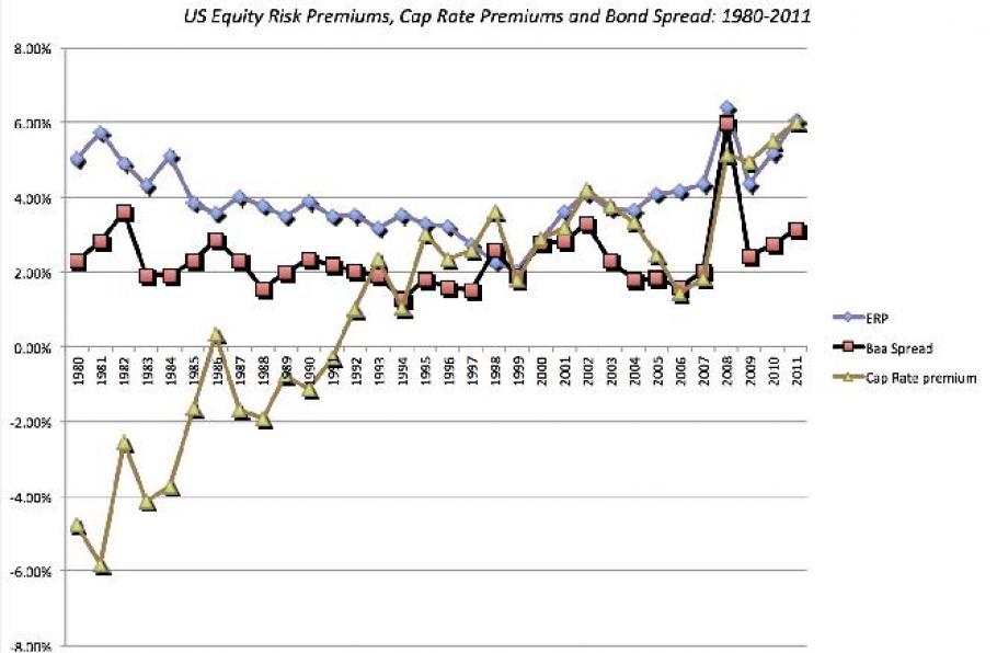 In onderstaande grafiek die Damodaran recent plaatste op zijn website staat de impliciete ERP, door hem berekend, afgebeeld vanaf 1980 (blauwgeblokte lijn). Hoe hoger hij staat, hoe beter dat zou moeten zijn voor de toekomstige aandelenrendementen. Een hoge stand (van bijna 6%) werd bereikt begin jaren tachtig (niet geheel toevallig het begin van de laatste grote bullmarkt in aandelen).