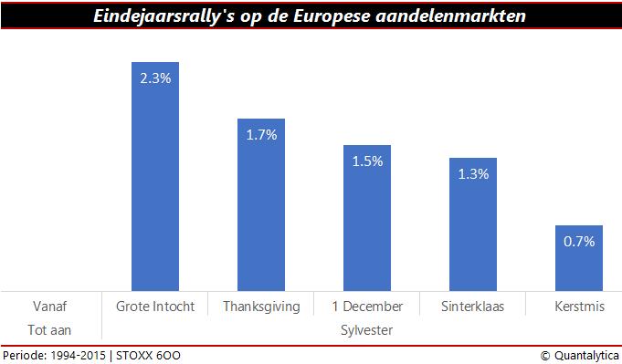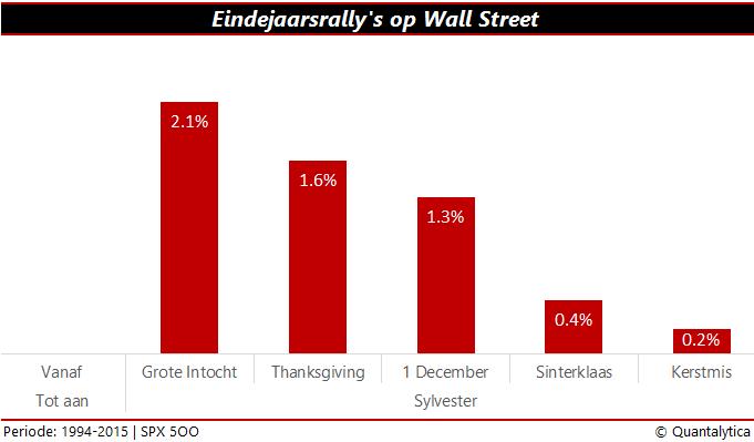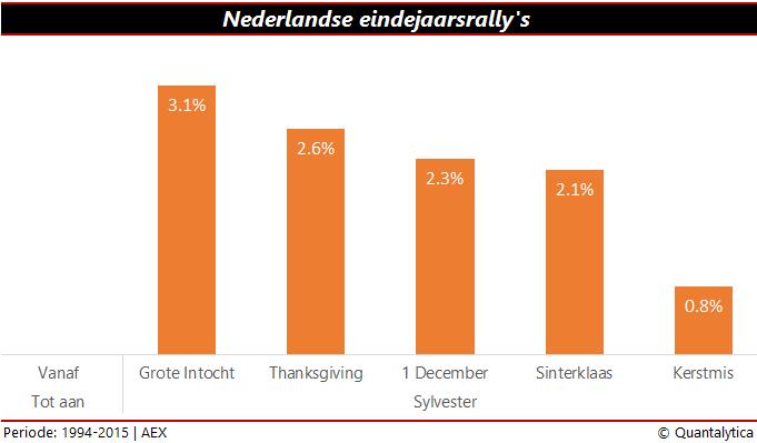 Naar welke periode je ook kijkt, in Nederland ligt het gemiddelde rendement tot aan oudejaarsavond voor eender welke eindejaarsrally (Grote Intocht, Thanksgiving, decembermaand, Sinterklaas of Kerstmis) telkenmale hoger dan op Wall Street.