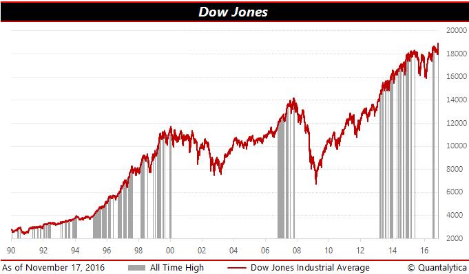 In de laatste weken van 2016 moeten beleggers niet alleen de voorgeprogrammeerde rentestap van de Federal Reserve verwerken, zij moeten op de koop toe afrekenen met een periode van onzekerheid. Zelden stelden economen en beursstrategen zich over het beleid van een aanstaande Amerikaanse president zoveel vragen als nu het geval is met Donald Trump. Maar dat weerhoudt de Dow Jones er niet van om nieuwe hoogterecords neer te zetten.