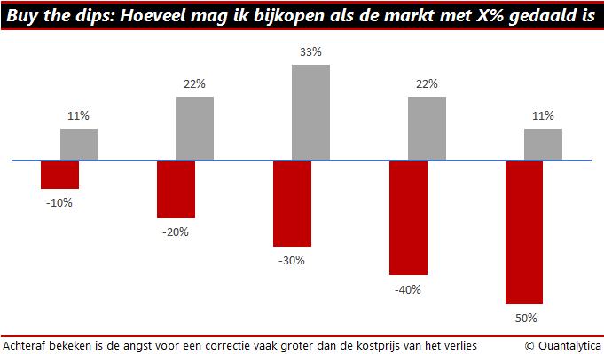 Maar hoe kunt u door de volatiliteit heen kijken? Een gespreide beleggingsportefeuille bestaat voor een deel uit liquiditeiten en idealiter stapt u op de bodem in, maar in de praktijk weet u nooit wanneer de bodembel wordt geluid. Als leidraad kunt u onderstaand schema gebruiken om bij een grotere koersdaling stapsgewijs aandelen te kopen.