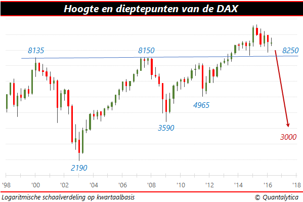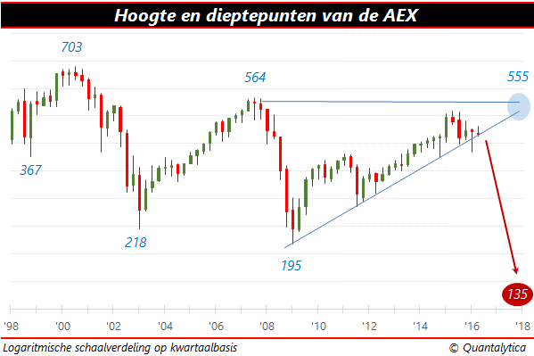 Als Edwards gelijk krijgt, dan corrigeert de S&P 500 tot 75 procent en duikt de Duitse DAX onder het puntenniveau van de 3000, een soortgelijke daling. Voor de AEX zou dat betekenen dat de Amsterdams hoofdindex amper nog 135 eenheden telt.