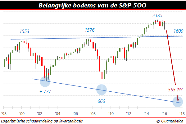 Het klinkt allemaal wat vergezocht. Onwaarschijnlijk is het niet. Het is immers al zeven jaar geleden dat er nog sprake was van een grote crisis. Zover zal het wellicht niet komen, maar een gewaarschuwd mens telt voor twee. Een daling tot de steunlijn, ±1600 punten, van de S&P 500 is niet uitgesloten, eerder waarschijnlijk, want bullmarkten duren niet eeuwig.