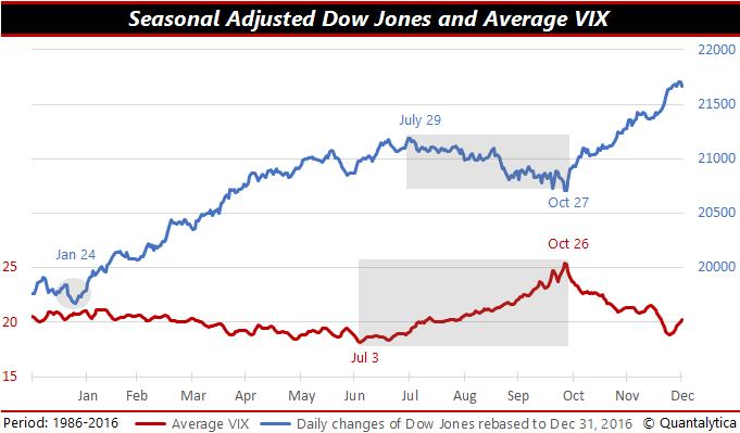 De vraag van 1 miljoen is natuurlijk: wat gaat de beurs de komende maanden doen? Wie het weet mag het zeggen, maar de vraag stellen is de vraag beantwoorden. Hoewel beleggers klagen over hoogtevrees, lijkt het erop dat de koersen tot aan de zomer zullen blijven stijgen. De economische berichten zijn gunstig en de dreiging van politieke risico’s is op korte termijn laag. De aandelenmarkten zullen in de zomermaanden een deel van hun winst prijsgeven, om dan met frisse moed hun weg omhoog te vervolgen. Dit scenario is ontleed aan het gemiddelde koersverloop van de Dow Jones.