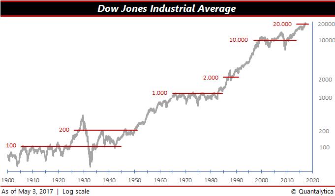 Als je een blik werpt op de langetermijngrafiek van de Dow Jones Industrial Average, alom bekend als de Dow Jones, dan valt het allemaal nogal mee. De huidige bull-run verbleekt bij de hausse van de jaren negentig of de herstelrally van de Grote Depressie uit de jaren dertig van de vorige eeuw.