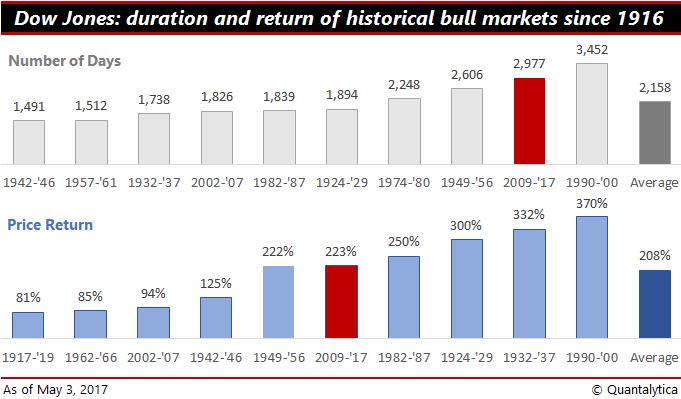 De toekomst laat zich niet voorspellen, maar als de Dow Jones door blijft stijgen tot en met 28 augustus 2018, dan wordt het langste bullmarkt aller tijden, althans toch sinds 1900. En als de oudste aandelenindex van de Verenigde Staten en misschien wel ter wereld in de tussenliggende periode ook nog eens aandikt tot het niveau van 30.762,19 punten, dan wordt het meteen ook de sterkste in magnitude.
